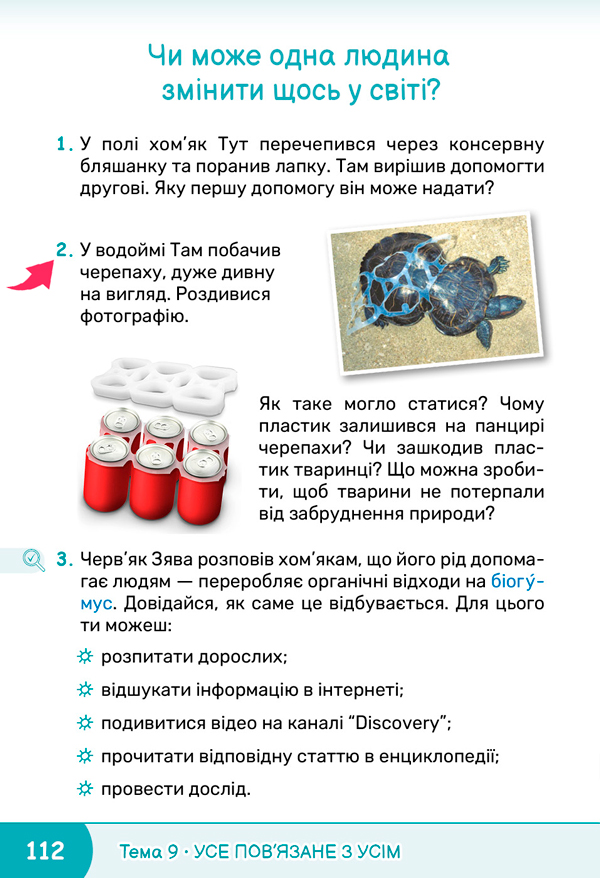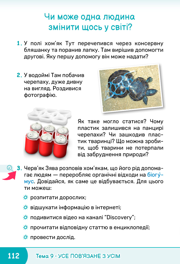 Пригадайте, що ви знаєте про черв’яків. А чи знаєте ви, що ці маленькі тваринки дуже допомагають людині змінювати світ на краще. Як саме? Відкрийте підручник на сторінці 112 і виконайте завдання 3. ![]() ![]() |