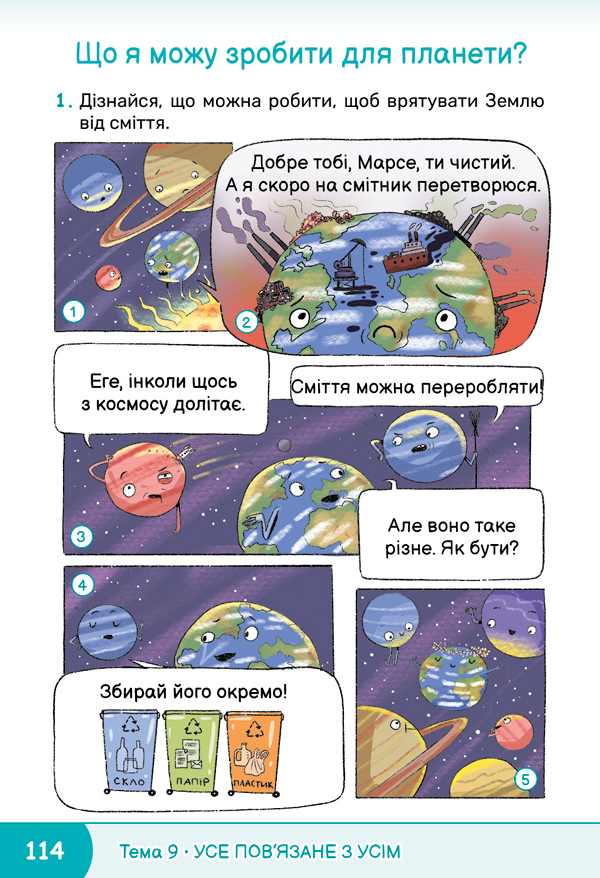 Пригадайте, яке ще сміття треба здавати окремо. Чому? Виконайте завдання 1 робочого зошита на сторінці 59 — дізнайтеся правило, виконуючи яке можна врятувати Землю. ![]() ![]() |