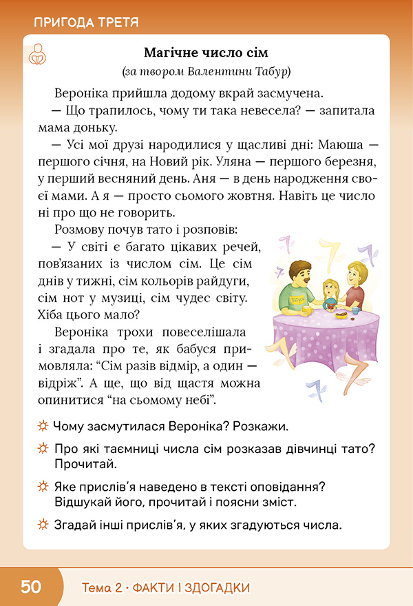 Сьогодні ми прочитаємо третю пригоду, яка сталася із героїнею твору Валентини Табур — Веронікою. Дізнаємося про магічне число сім.