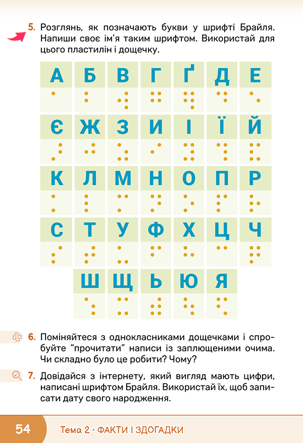 Розгляньте на с. 54 підручника, як позначаються букви шрифту Брайля. ![]() ![]() |