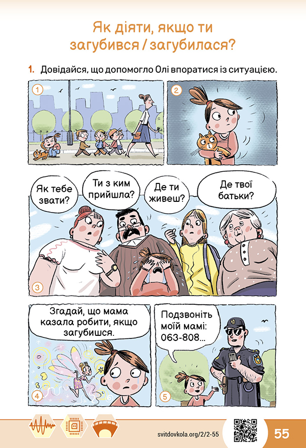 Сьогодні ми будемо працювати з коміксом про одну непросту ситуацію, яка сталася з вашою ровесницею. Ви будете вчитися орієнтуватися у складних ситуаціях та дізнаєтеся, до яких людей можна звернутися по допомогу, якщо заблукали чи загубилися. |