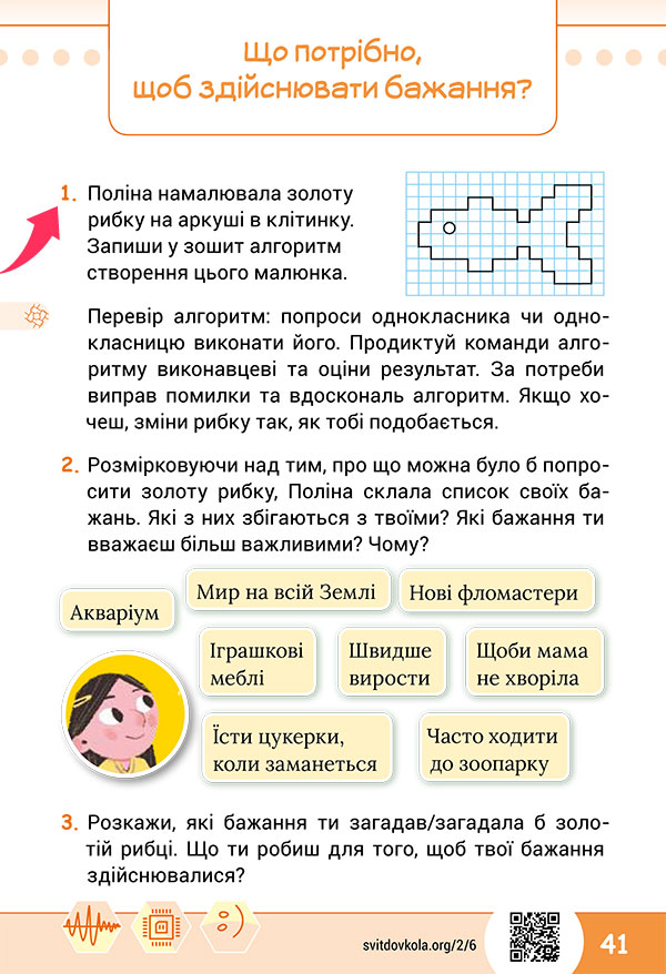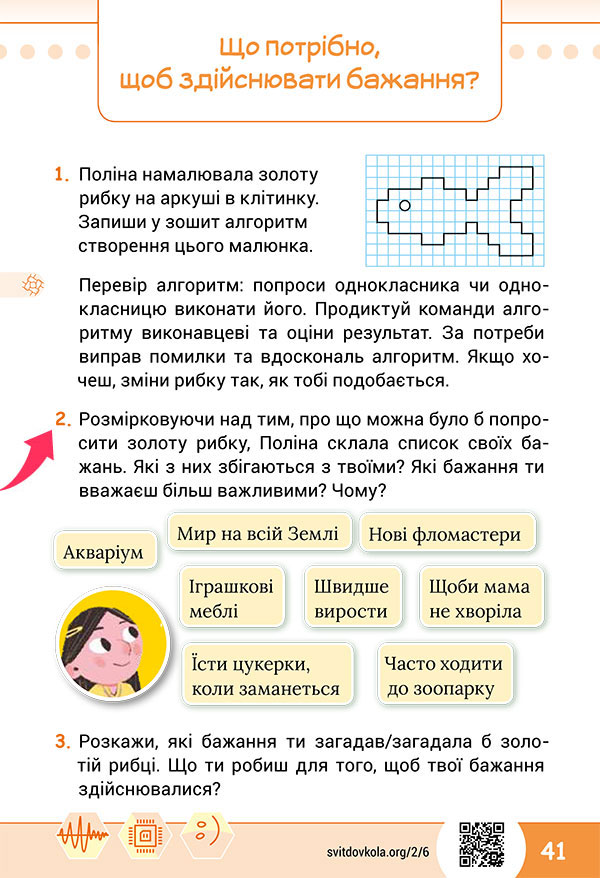 А якби ви мали золоту рибку, то які три бажання загадали б? Прочитайте перелік бажань. Оберіть із них тільки 3 і запишіть біля рибки, яку намалювали, коли перевіряли свій алгоритм. Обґрунтуйте свій вибір.
