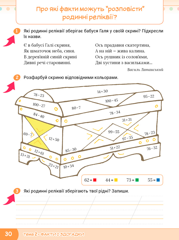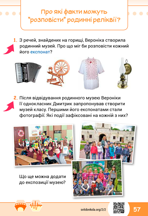 Українські родини особливі своєю єдністю. Молодші допомагають старшим, а старші — молодшим. Старші покоління передають молодшим свою мудрість, а молодші навчають старших нового — того, чого в часи їх дитинства й юності ще не було. З кожним новим поколінням рід стає сильнішим, мудрішим, розумнішим, розвиненішим. Насправді наші мами й тата мріють, щоб ми виросли ще розумнішими й мудрішими за них. А вчителі хочуть, щоб ви навчились більшого, ніж знають та вміють вони самі! Для цього треба навчатись нового, а ще — брати знання й переймати найкращі риси у старших: у своїх мам і тат, бабусь і дідусів, прабабусь і прадідусів… У спадок від старших нам залишається не лише мудрість, але й речі, які вони зробили своїми руками або купили чи одержали в нагороду. Такі речі стають родинними реліквіями. Тож сьогодні ми поговоримо про родинні реліквії. |