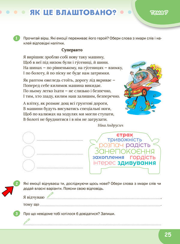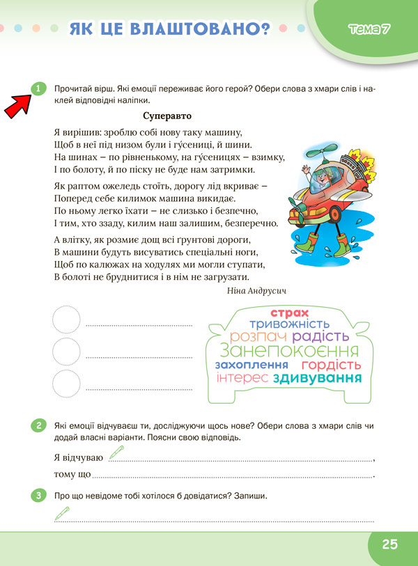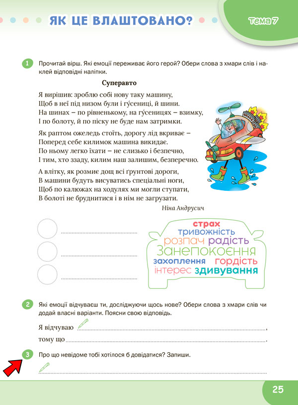 Прочитайте вірш. Які емоції переживає його герой? Оберіть слова з хмари слів і наклейте відповідні наліпки (зош., с. 25, завд. 1).