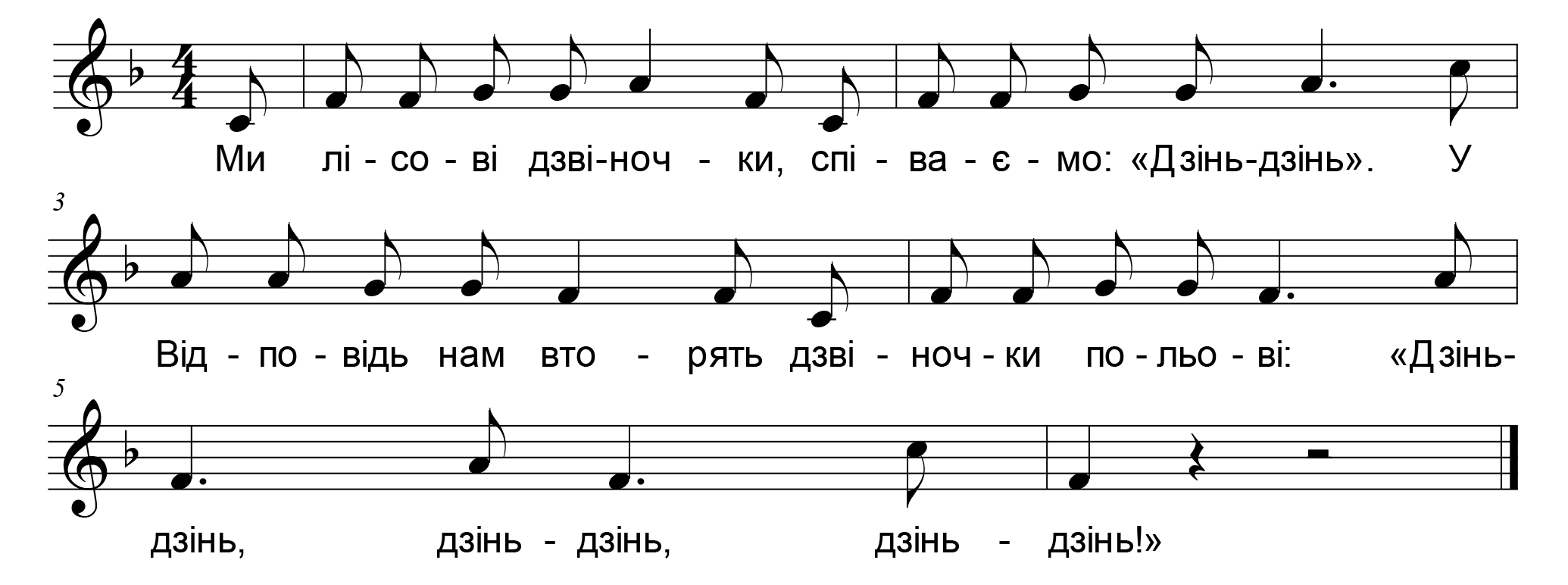 Ми лісові дзвіночки, Співаємо: «Дзінь-дзінь». У відповідь нам вторять Дзвіночки польові: «Дзінь-дзінь, дзінь-дзінь, дзінь-дзінь!».