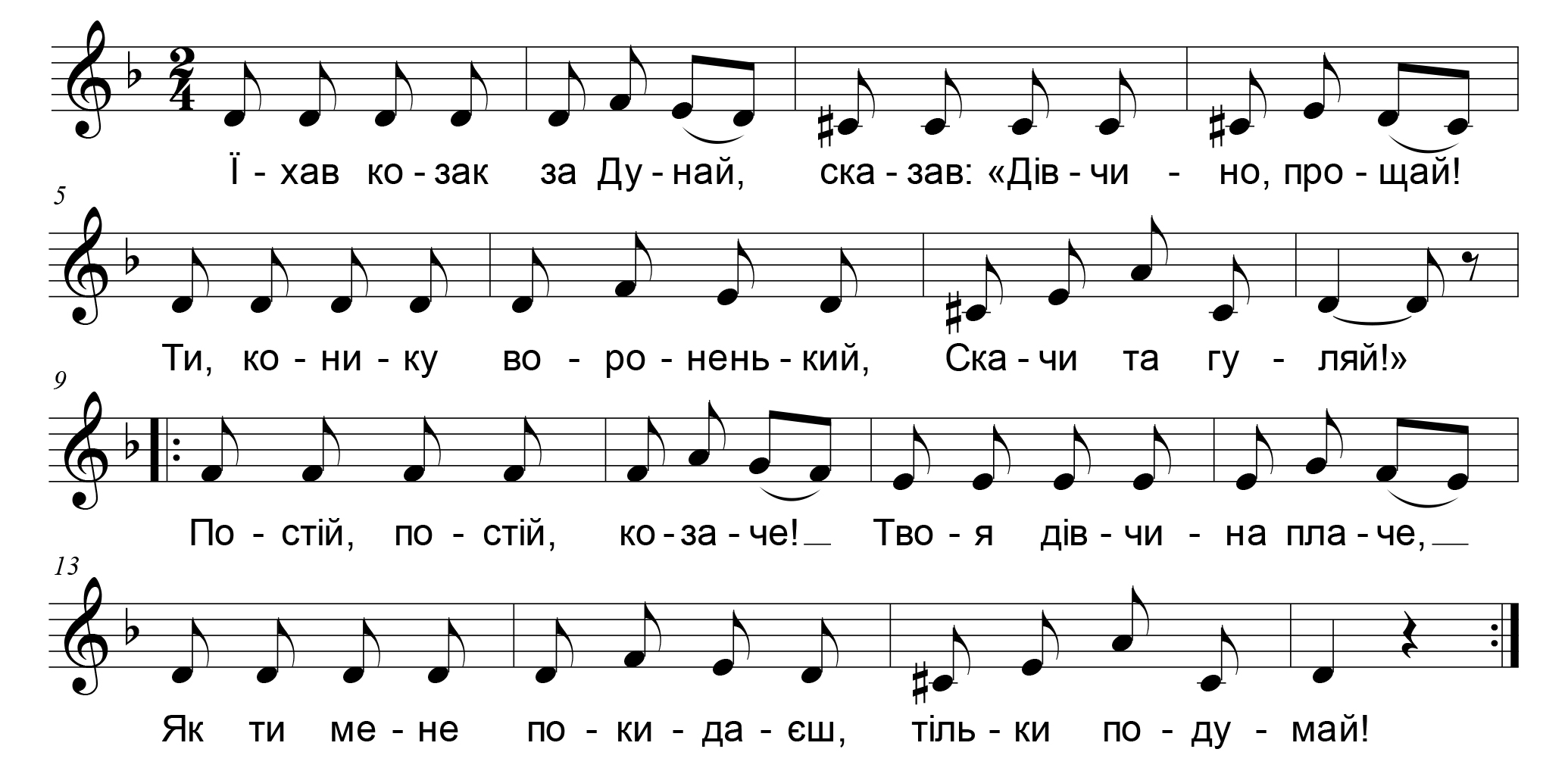 Їхав козак за Дунай, Сказав: "Дівчино, прощай!" Ти, конику вороненький, Неси та гуляй. – Постій, постій, козаче! Твоя дівчина плаче. Як ти мене покидаєш – Тільки подумай!