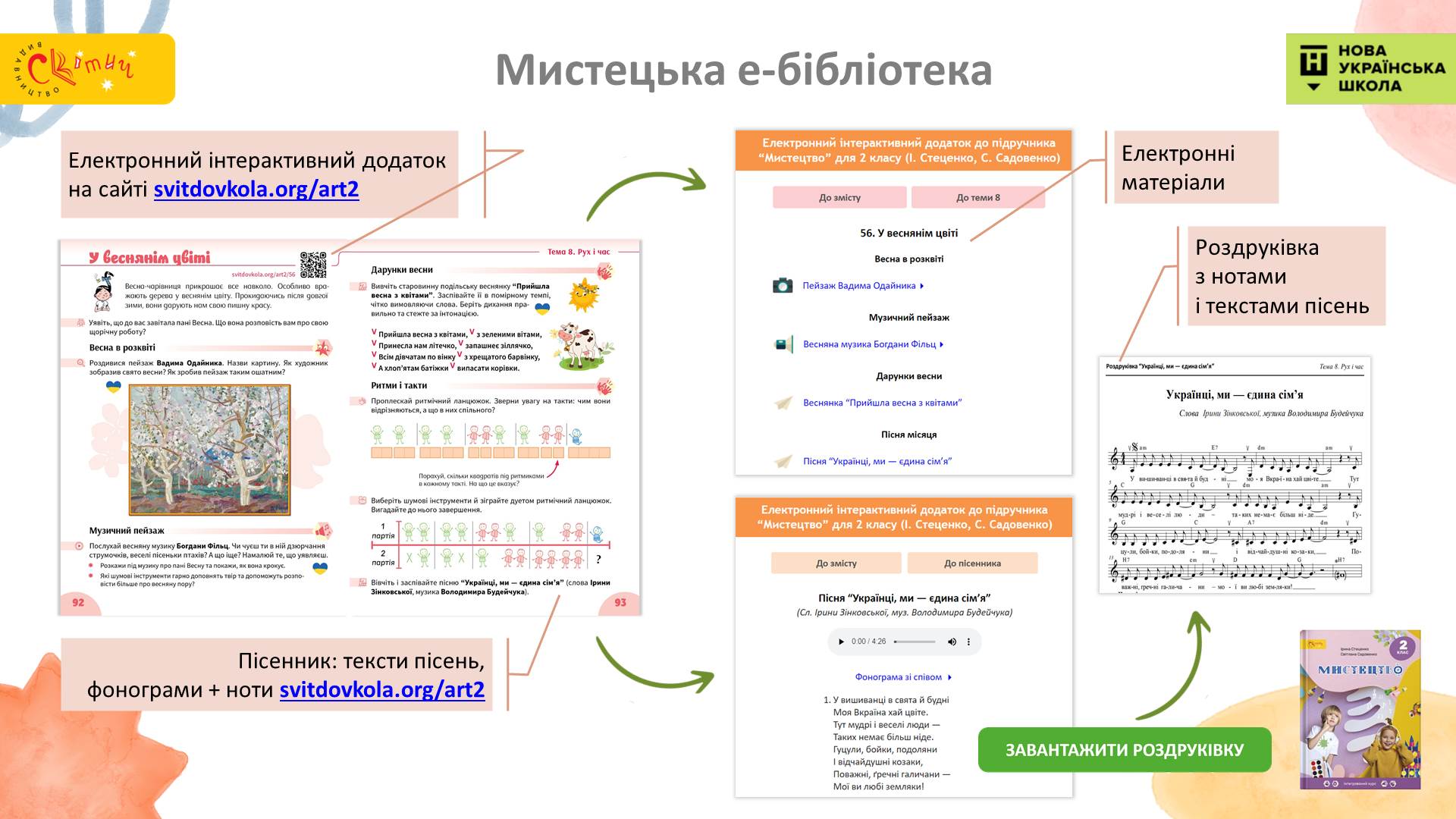 До підручника створена артбібліотека з електронними матеріалами до кожної мистецької історії. За QR-кодами можна завантажити всі художні та музичні твори, згадані в підручнику, а також пісенник (з фонограмами, нотами, текстами пісень, розспівок) та відповіді на запитання для самоперевірки.
