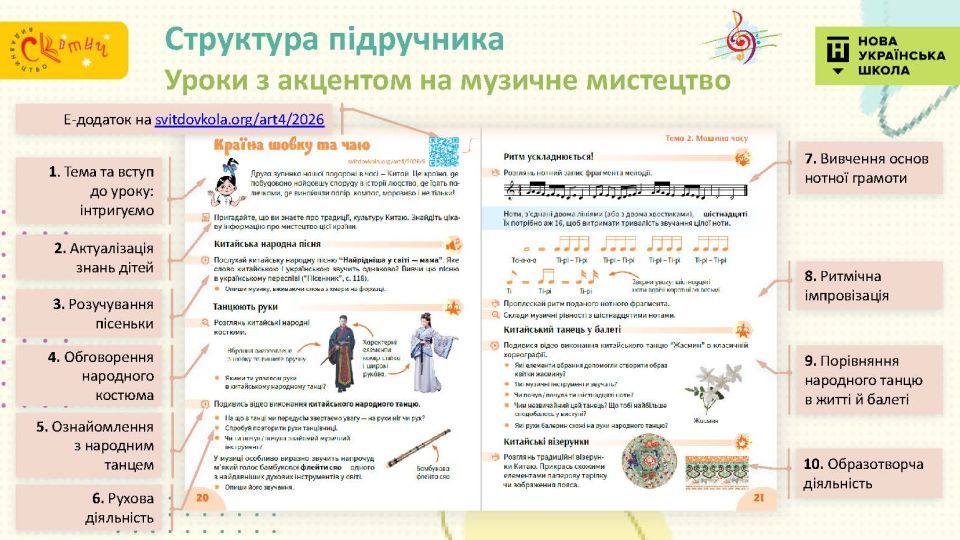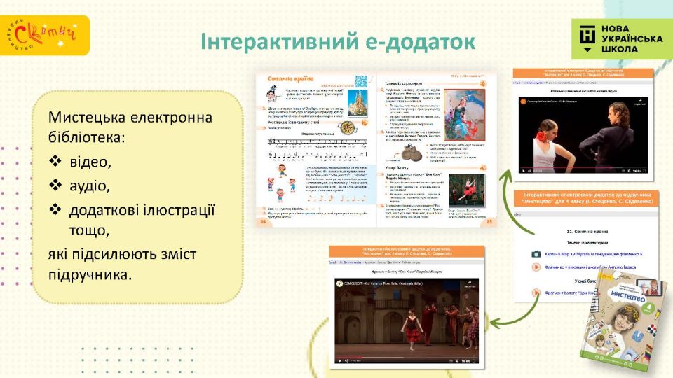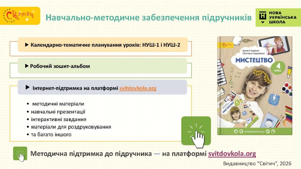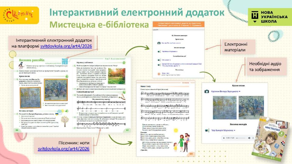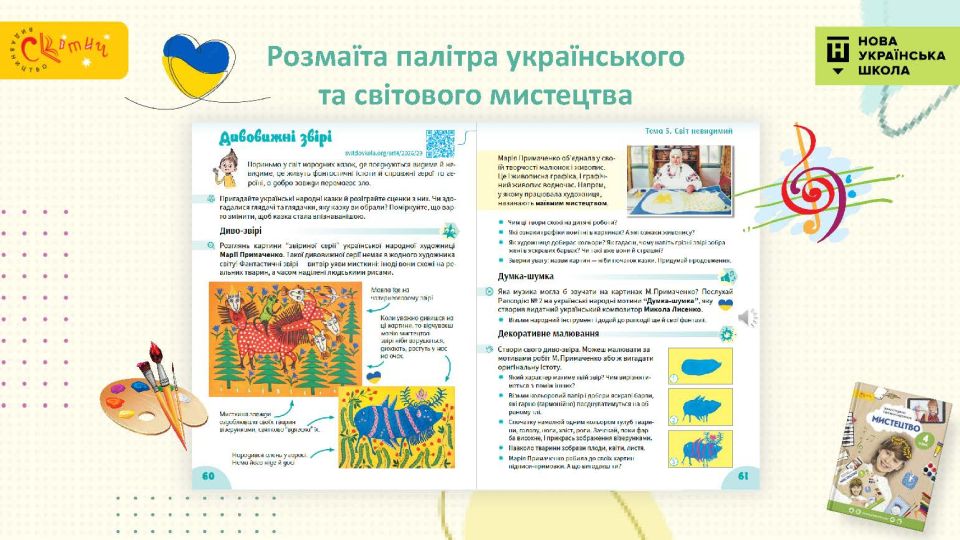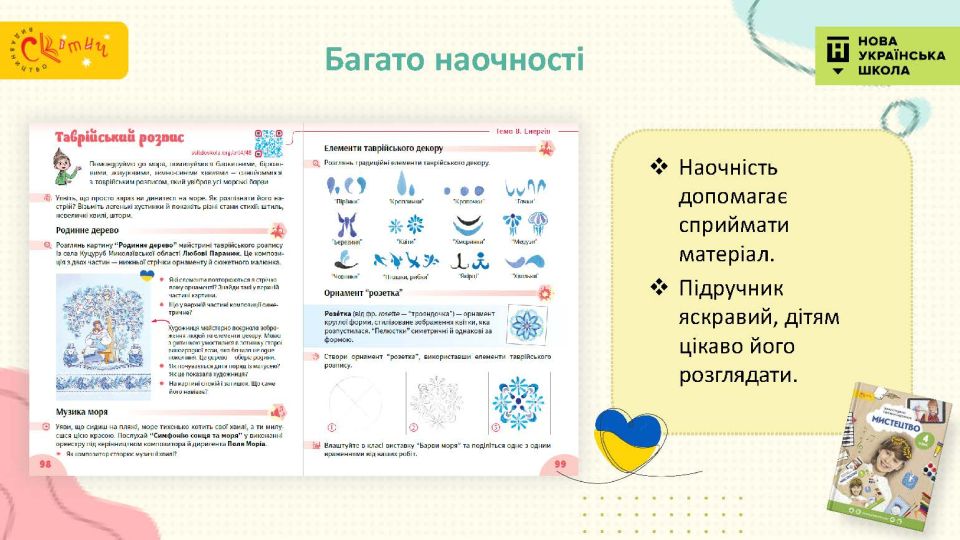 - З Україною в серці — підручник відкриває четвертокласникам багато імен українських митців, традиційні декоративні розписи тощо — це справжня мистецька мандрівка тривалістю в рік.