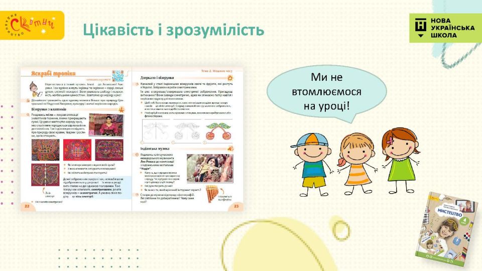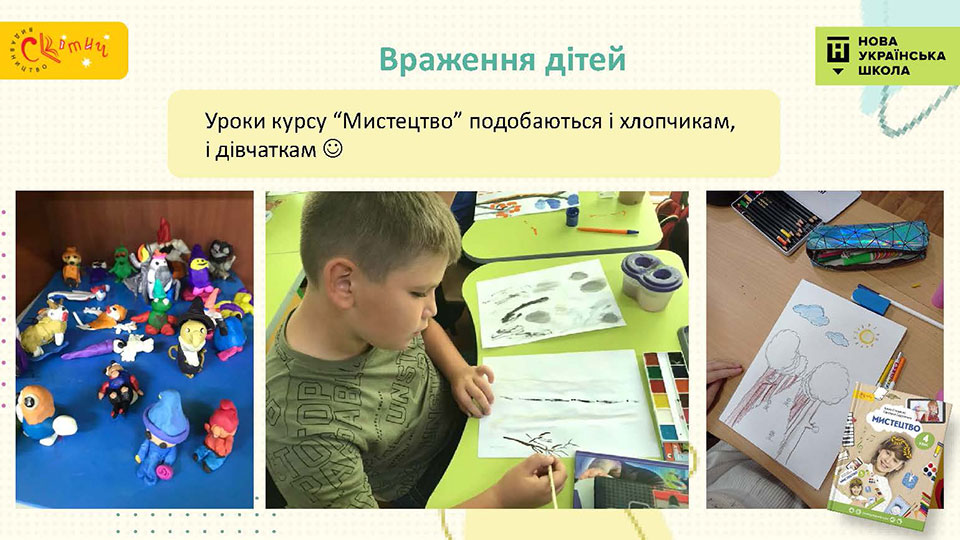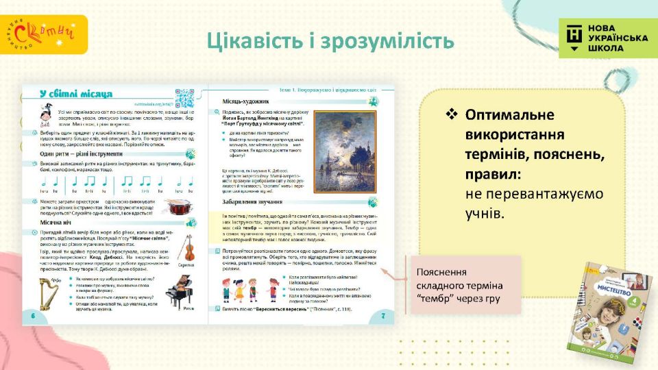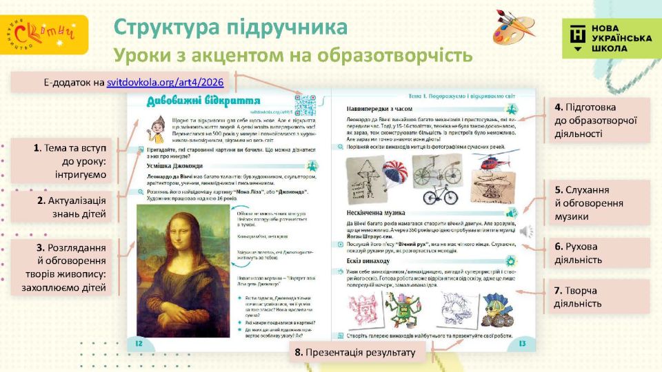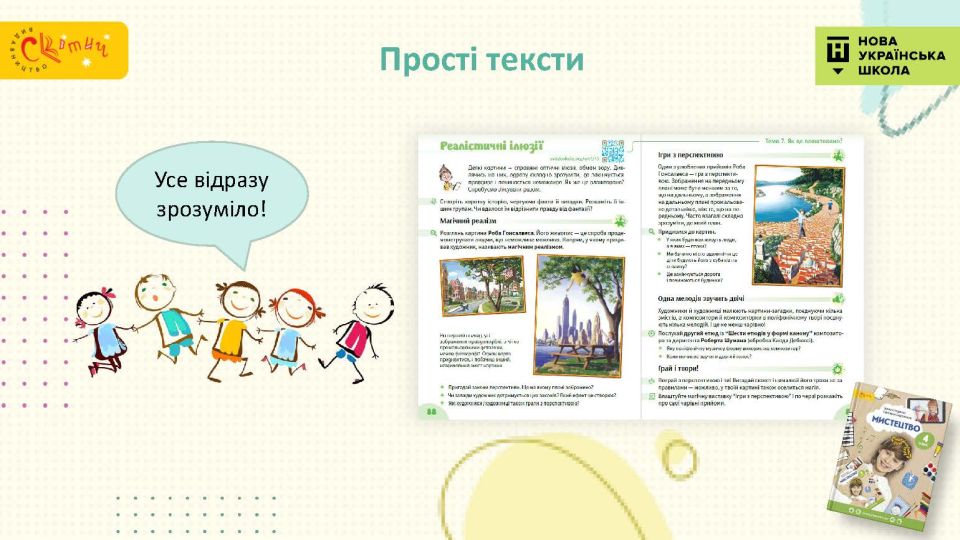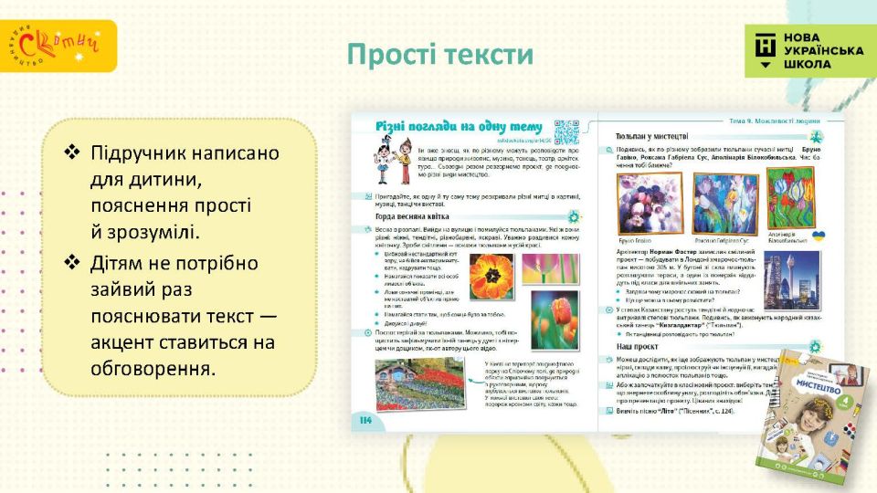 - Сучасний підручник для сучасної дитини — використовуємо як класичні, так і сучасні твори мистецтва, діти у творах живопису впізнають себе.