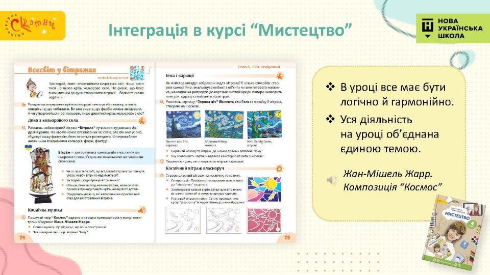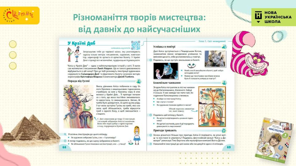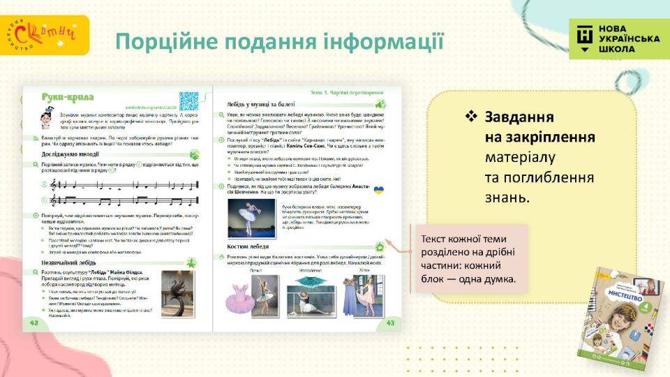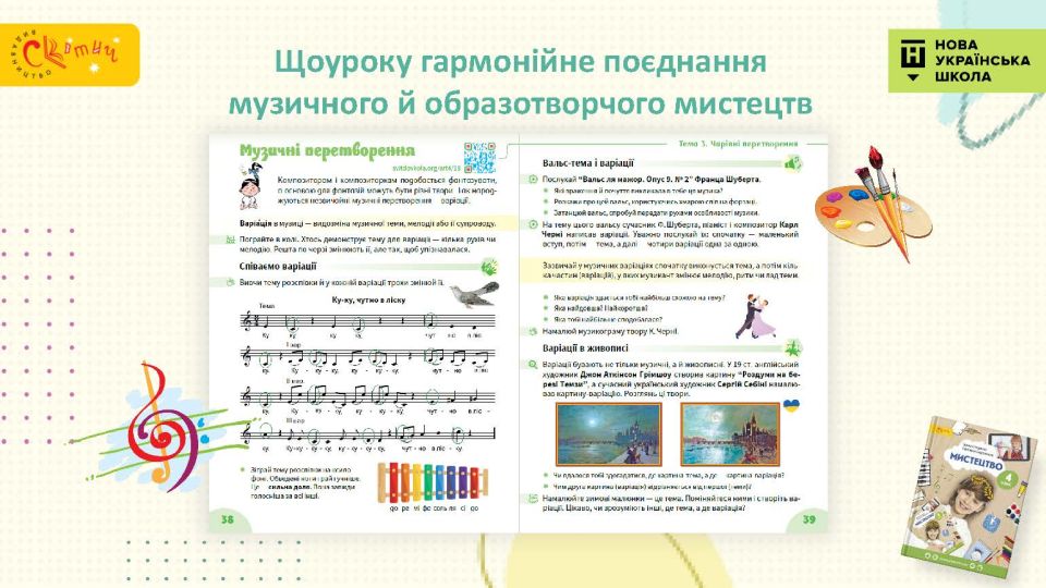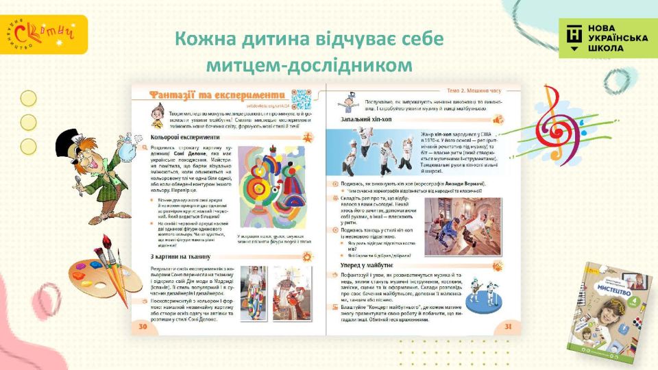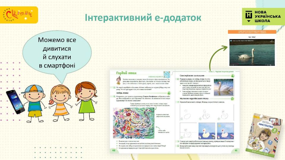- Сучасний підручник для сучасної дитини — використовуємо як класичні, так і сучасні твори мистецтва, діти у творах живопису впізнають себе.