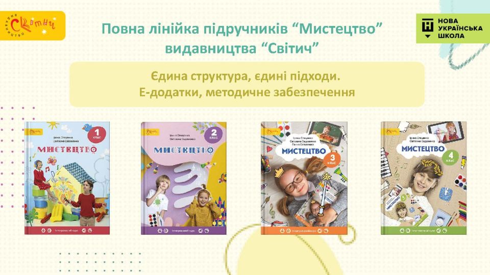 Усі підручники інтегрованого курсу “Мистецтво” в лінійці підручників видавництва “Світич” мають єдину структуру, реалізують єдині підходи, містять однакові за ідеєю е-додатки й необхідне вчителю методичне забезпечення. Тож в усіх підручниках лінійки забезпечено наступність.