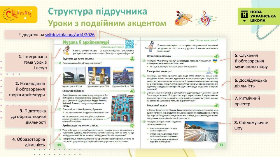 За впровадженою в підручнику методикою, учні — не пасивні спостерігачі й слухачі, а дослідники й експериментатори. Авторки спонукають працювати з різними матеріалами, у різних техніках, відкривати таємниці ритму, тактів і звучання музичних інструментів, виготовляти інструменти власноруч і грати на них. Твори мистецтва близькі й зрозумілі дітям, надихають на створення власних самобутніх творів.