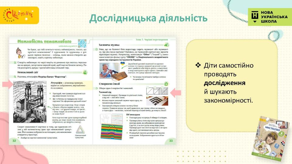 - Підручник мотивує учнів — захопливі твори мистецтва дивують дітей, мотивують досліджувати їх, із захопленням чекати наступних уроків.