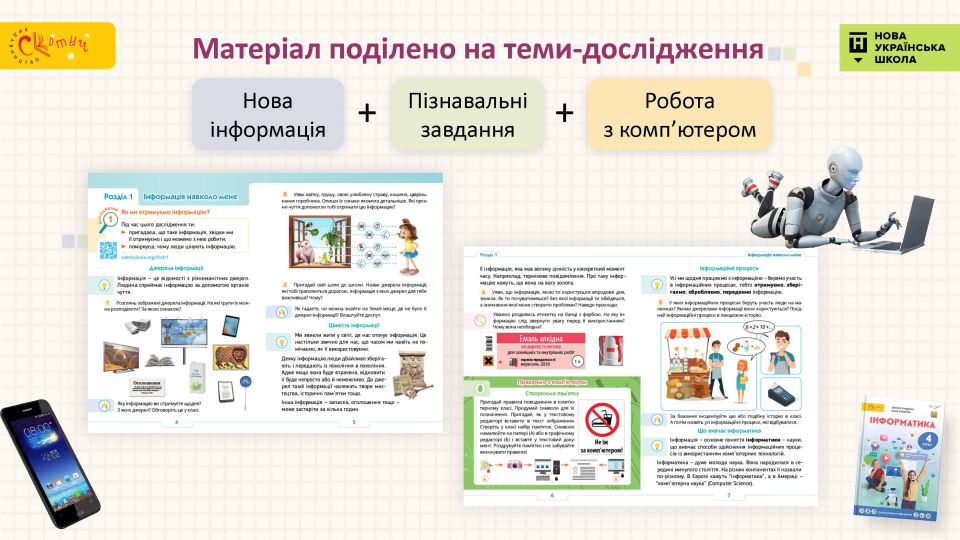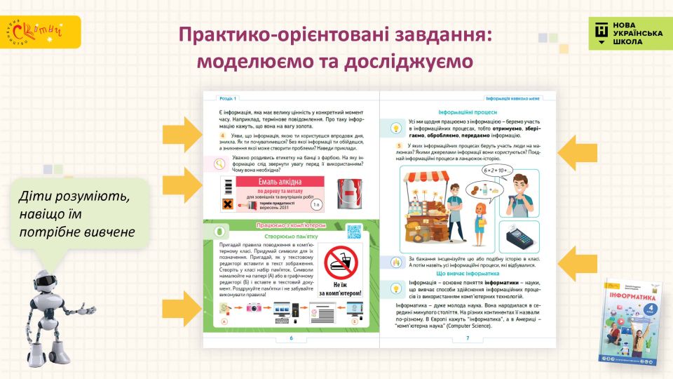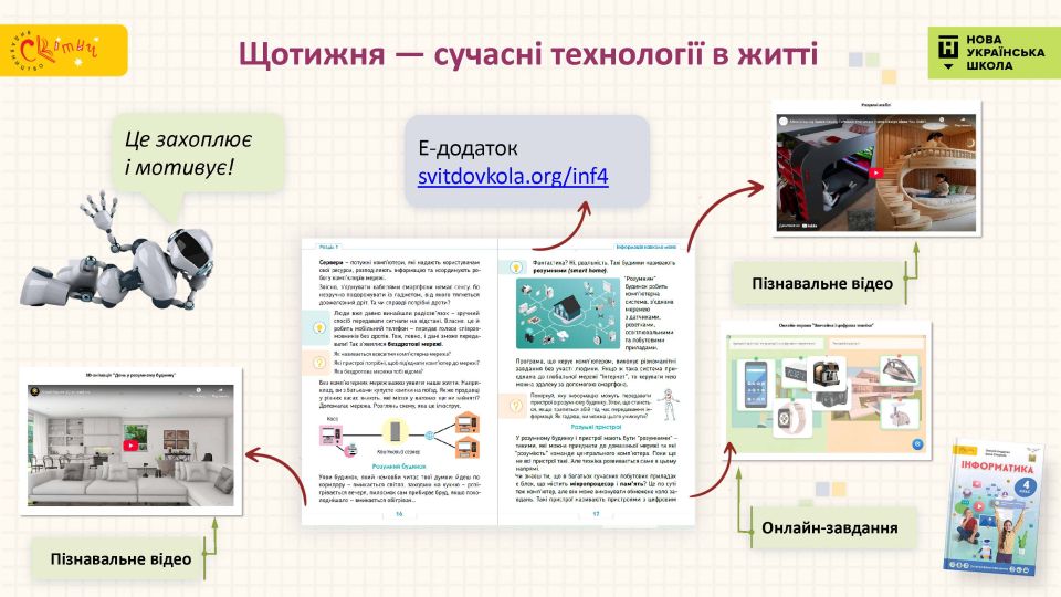- Підручник мотивує учнів — щотижня нове дослідження: розповідь про сучасні технології поряд із дітьми, захопливі форми роботи, лаконічне подання матеріалу, динамічна зміна видів діяльності.