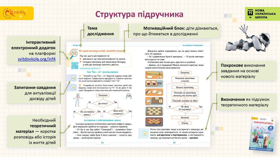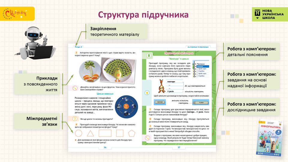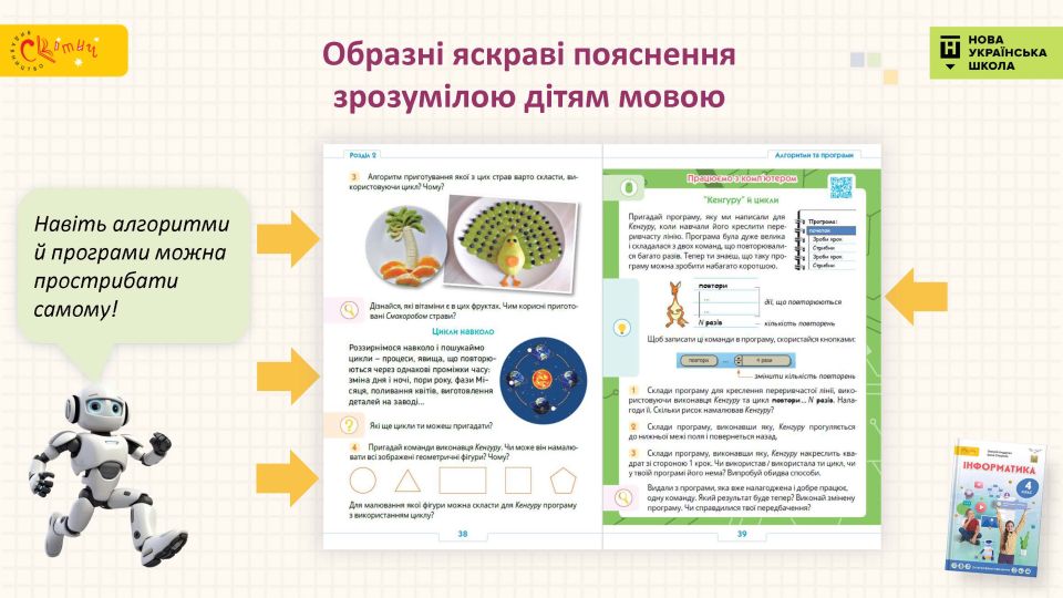 - Наочне подання інформації — інфографіка та схеми, текстові пояснення доповнені зрозумілими дітям зображеннями.
