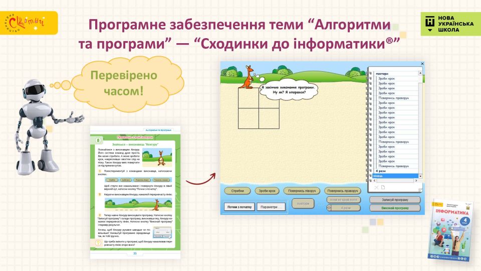 - Усе перевірено — креативний підручник нового формату, завдання якого випробовують учителі вже понад 5 років. Використані перевірені часом дружні до дитини авторські “Сходинки до інформатики®”.