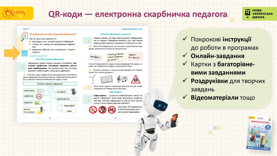 На кожному розвороті підручника є QR-код, за яким доступна добірка медіаматеріалів із теми: цікаві відео, онлайн-завдання, інші медіафайли, які мотивують дітей, допомагають їм максимально ефективно засвоювати матеріал. А для вчителя це справжній скарб, який допоможе зробити уроки яскравими і якісними.
