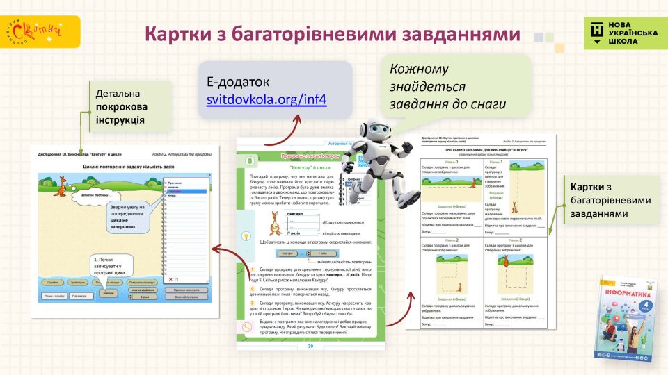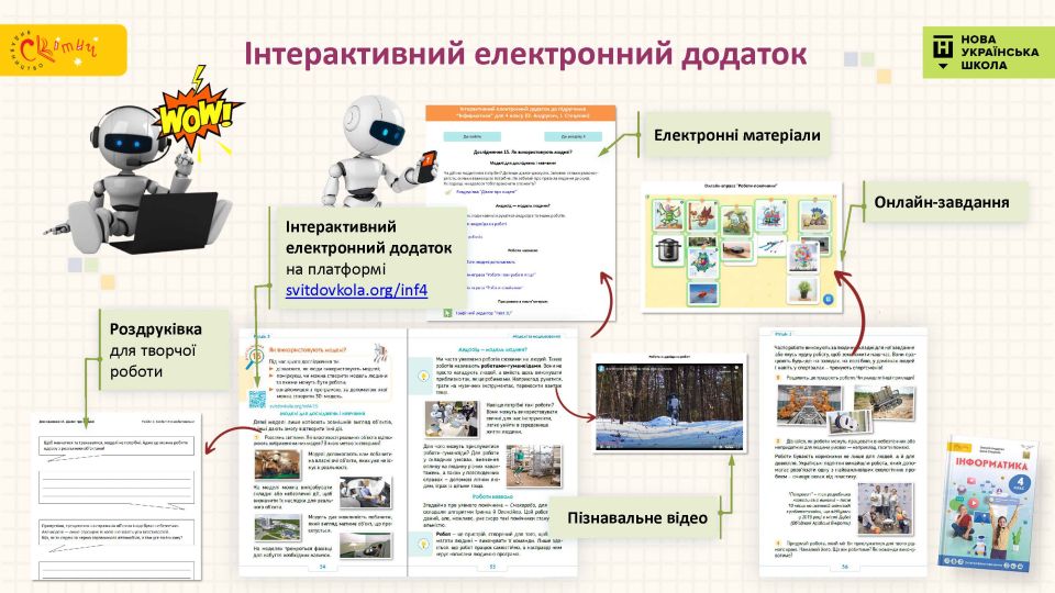 - Електронний інтерактивний додаток — онлайн-завдання для учня, покрокові інструкції, картки з багаторівневими завданнями, роздруківки, пізнавальні відео, — усе для цікавого й ефективного навчання.