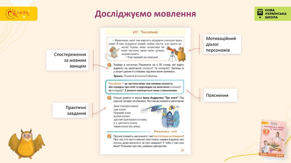 Завдання на дослідження мовних явищ заохочують учнів спостерігати за мовленням, робити висновки та правильно їх формулювати. У цій діяльності школярів супроводжує персонаж Мовознай. У підручнику застосовано діяльнісний підхід, за якого дитина може самостійно здобувати знання, а не пасивно засвоювати готові твердження. За допомогою прикладів, ілюстрацій та системи послідовних запитань учні доходять висновку про те, що таке, наприклад, основа й закінчення, корінь, спільнокореневі слова. Засвоєнню мовних понять сприяють діалоги та окремі репліки персонажів підручника.