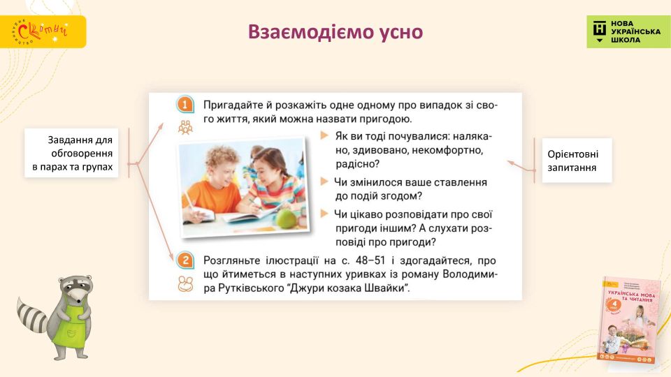 Парні та групові завдання в підручнику передбачають регулярну практику усного мовлення. Система завдань учить дітей ефективної комунікації не через інсценування вигаданих діалогів, а в процесі спілкування та обговорення цікавих для дітей тем.