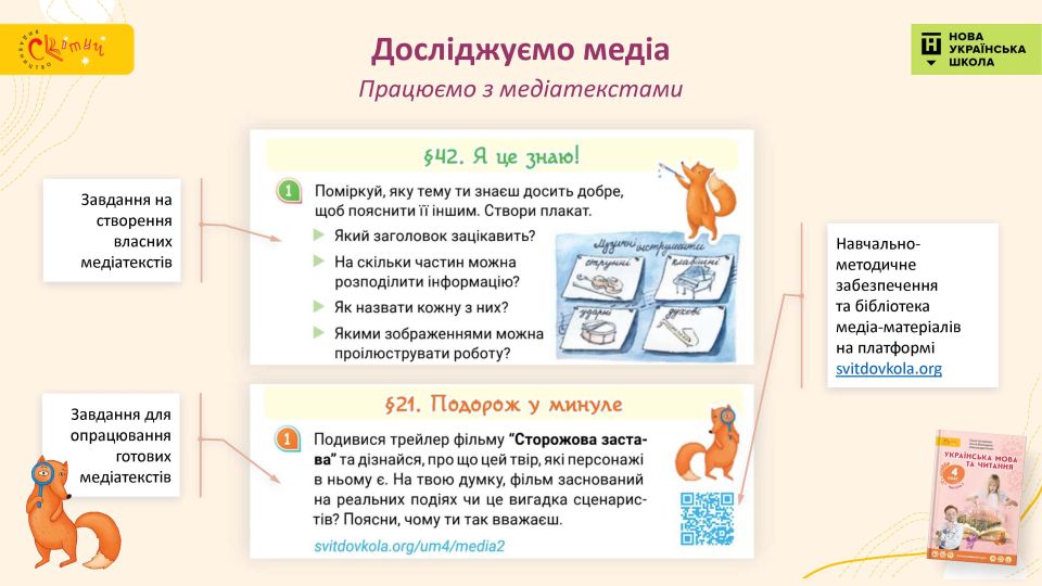 Зверніть увагу на якісний авторський цифровий супровід підручника, розроблений до кожної теми в різноманітті відео-, аудіо-, графічної та інших видів інформації. Ці актуальні матеріали відображають інтереси сучасної дитини. Четвертокласники знаходять тут саме те, що цікавить їх у житті і що вони із задоволенням обговорюють.