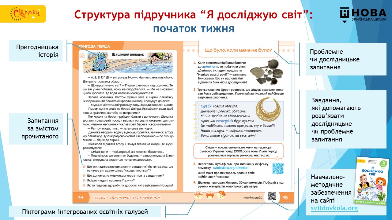 Флагманський підручник НУШ є частиною комплекту, до якого також увійшли підручники “Українська мова та читання” і “Мистецтво”. Усі три підручники поєднані спільними темами модельної програми, що забезпечує реалізацію принципу наскрізної інтеграції.