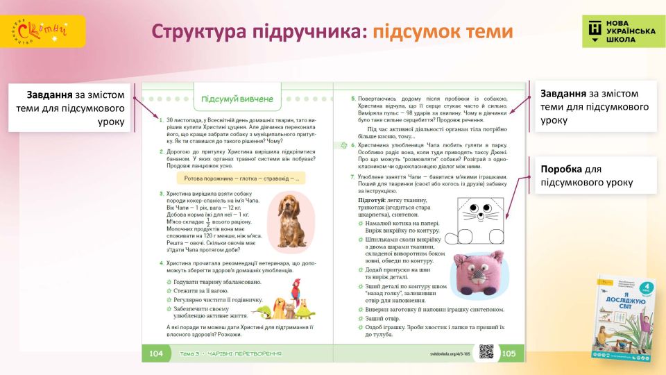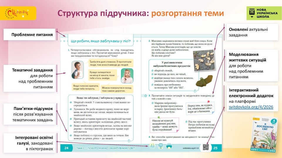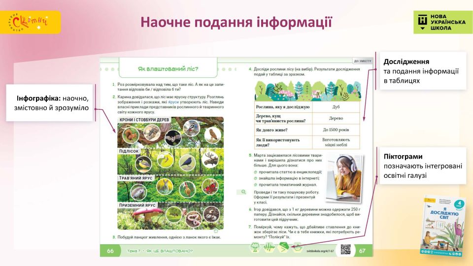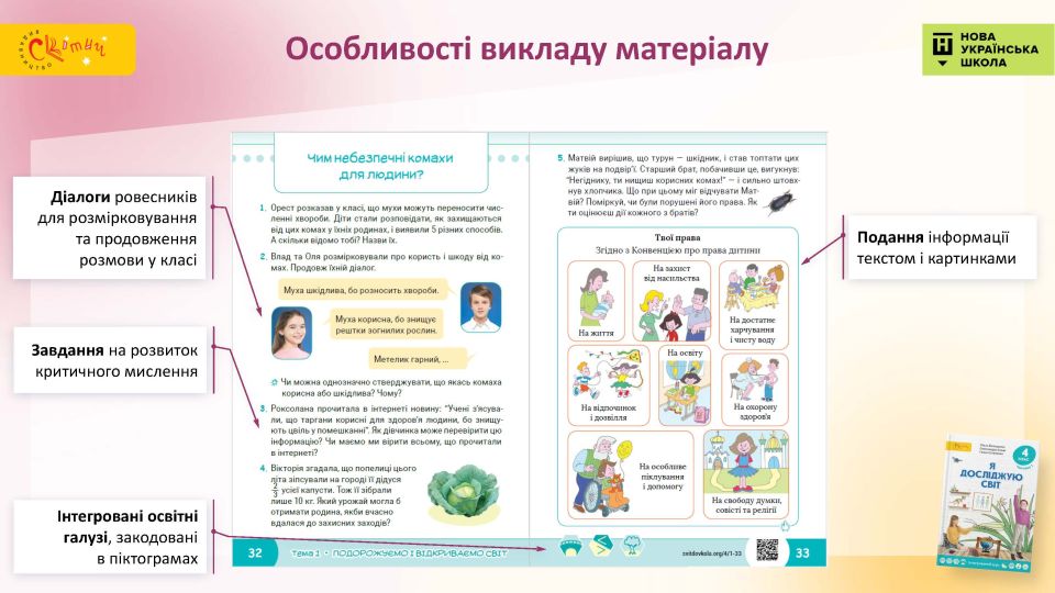 - Наочне подання інформації — сюжетні малюнки вводять учнів у кожну тему, текстові пояснення доповнені зрозумілими дітям зображеннями.