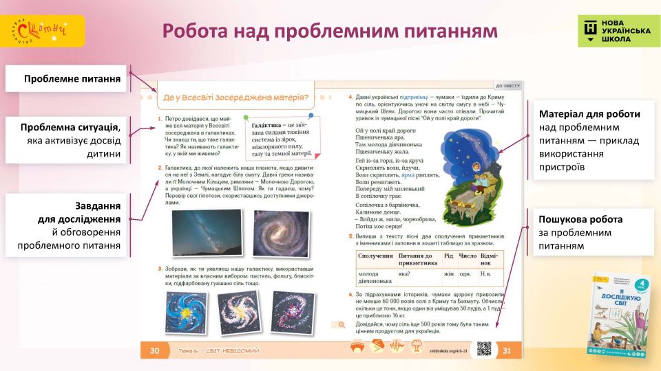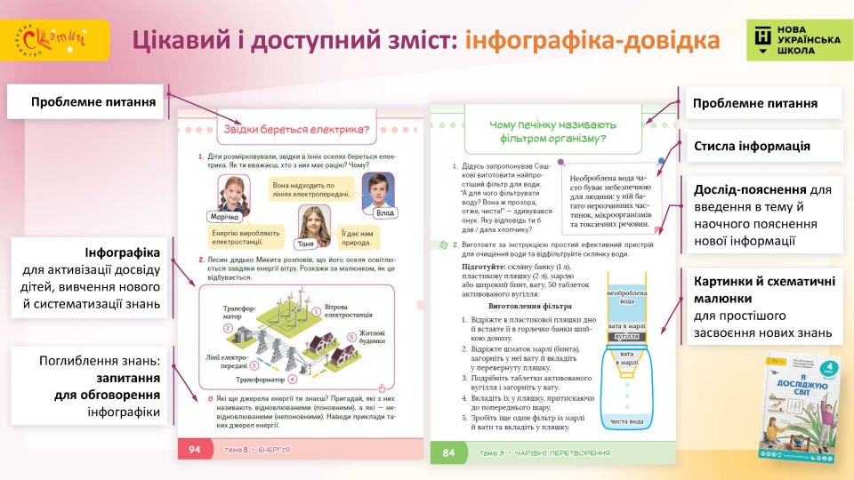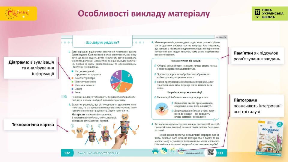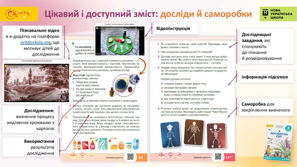 - Діяльнісний підхід на повну силу — використання дитячих ініціатив, активне пізнання на кожній сторінці — проєкти, диференціація навчання, дослідницька діяльність тощо.