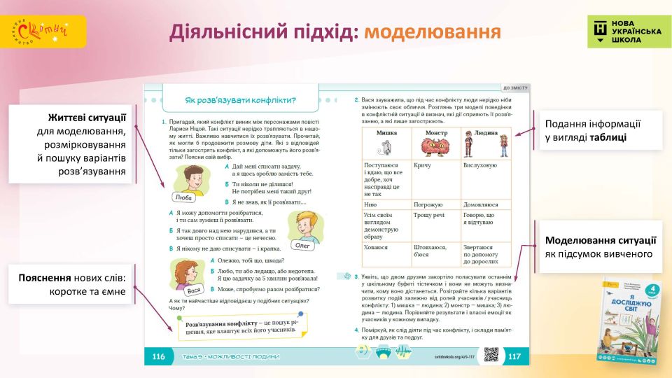 Завдання підручника допомагають навчити дітей працювати в парах і групах, разом робити висновки й навіть сперечатися, поважаючи всіх членів групи.