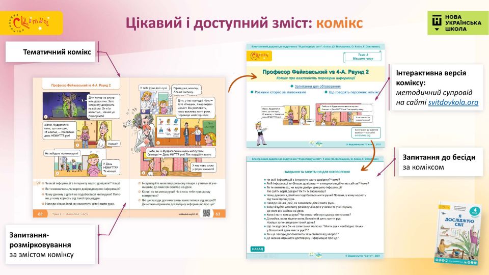- Пізнавальні комікси — ємні, повчальні й близькі дитині — дотепно розповідають четвертокласникам про життєві ситуації, наочно демонструють, як слід або не слід у них діяти.
