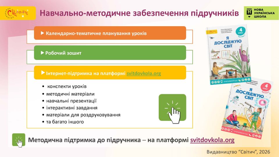 - Повний методичний супровід на SvitDovkola.org — методичні матеріали, презентації, розробки уроків (очні й дистанційні), безоплатні навчальні вебінари та курси підвищення кваліфікації для вчителів.