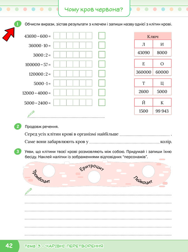 Обчисліть вирази, зіставте результати з ключем і запишіть назву однієї із клітин крові (зош., с. 42, завд. 1)