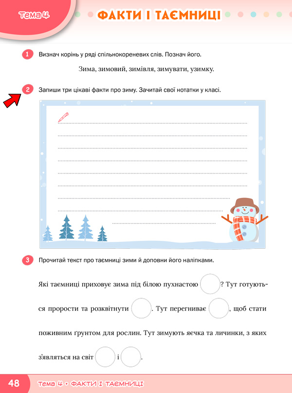 Запишіть три цікавих факти про зиму. Зачитайте свої нотатки в класі (зош., с. 48, завд. 2).