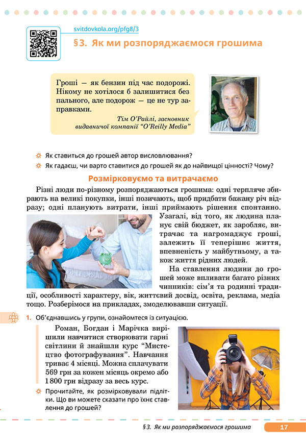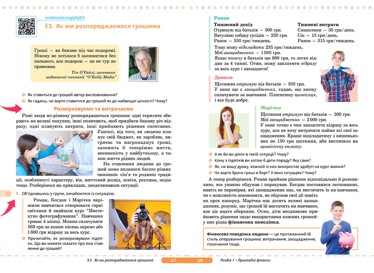 Аналізуємо фінансову поведінку (робота в групах) — Прочитайте текст на сторінці 17 і виконайте завдання 1 на сторінках 17-18 підручника. ![]() ![]() Об’єднайтеся в групи. Обговоріть поведінку кожного підлітка: