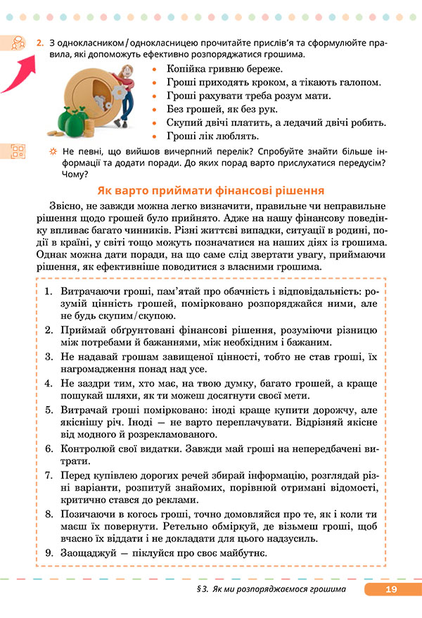 - аргументує власну позицію щодо фінансових рішень у побутових ситуаціях;