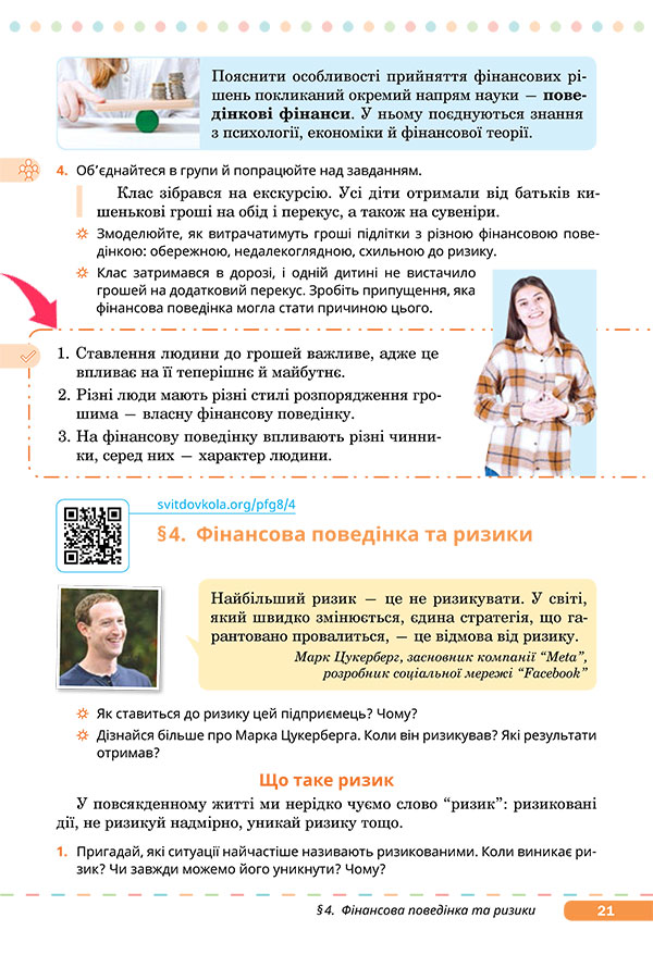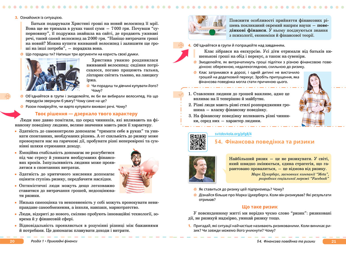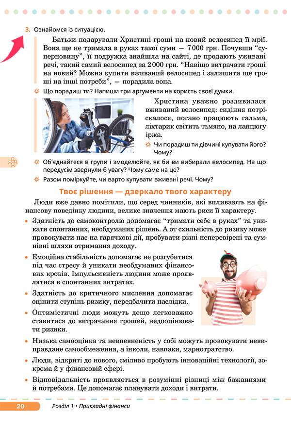 Продовжимо подорож світом фінансів і дослідимо, що таке фінансова поведінка і чому вона буває дуже різною в різних людей. Дізнаємося, як наші рішення щодо грошей пов’язані з рисами характеру. Проаналізуємо реальні ситуації, у яких потрібно ухвалити розумне фінансове рішення. Створимо власні правила обережного розпоряджання грошима. Для початку поміркуйте: