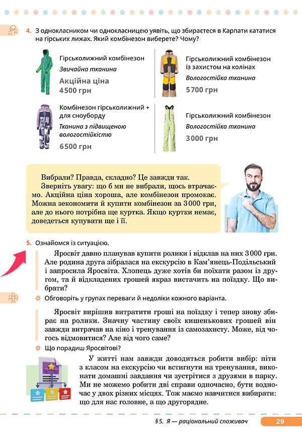 Обираємо товар (робота групами) — Виконайте завдання 4 на сторінці 29 підручника. Ознайомтеся з 4 варіантами гірськолижних комбінезонів. Визначте, який із них ви виберете для подорожі. ![]() ![]() Аргументуйте свій вибір: чому саме цей? Що стало вирішальним: ціна, якість, додаткові властивості?