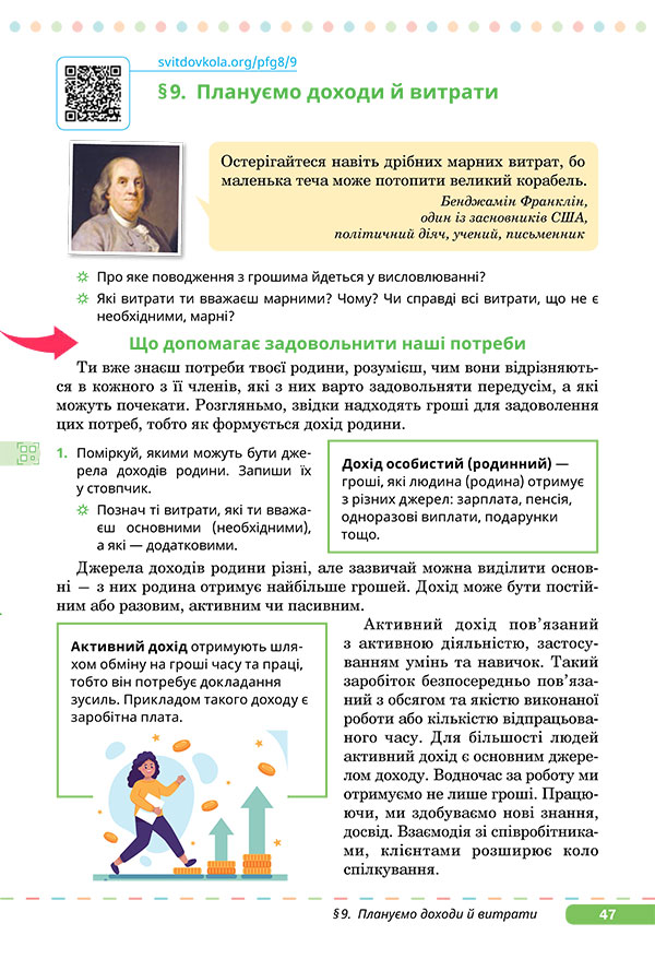 Приклад Бенджаміна Франкліна навчає нас, що планування доходів і витрат — це не просто бухгалтерія. Це стратегія життя. Це вміння перетворювати свій час на гроші, контролювати бажання, щоб мати змогу фінансувати потреби, і заощаджувати, щоб робити інвестиції у своє майбутнє й майбутнє суспільства. Отож почнімо! Готові зануритися у світ фінансової грамотності? |
