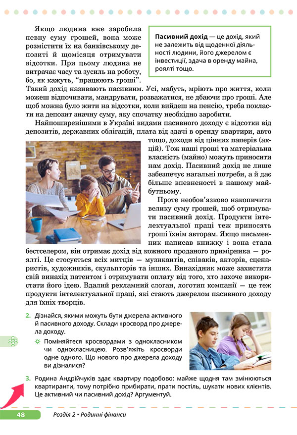 - Поглибити знання про джерела доходів родини, формувати уявлення про активний та пасивний дохід, а також усвідомити роль різних джерел доходів у забезпеченні потреб родини.
