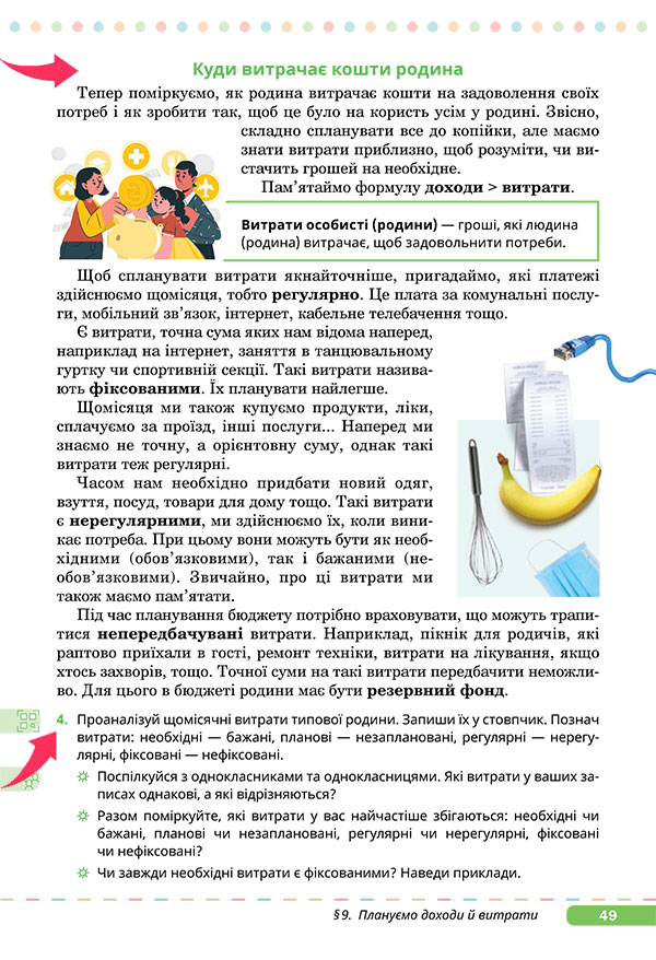- називає основні напрями витрат родини (харчування, житло, транспорт, освіта, дозвілля тощо);