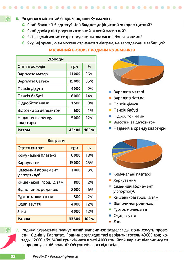 - аналізує приклад сімейного бюджету й робить висновки;
