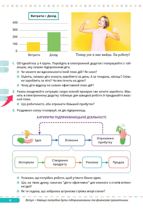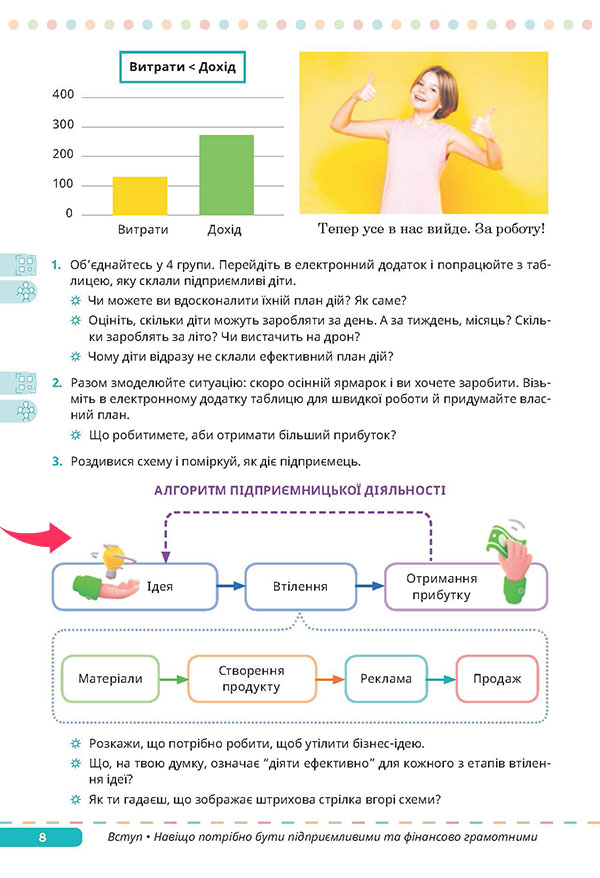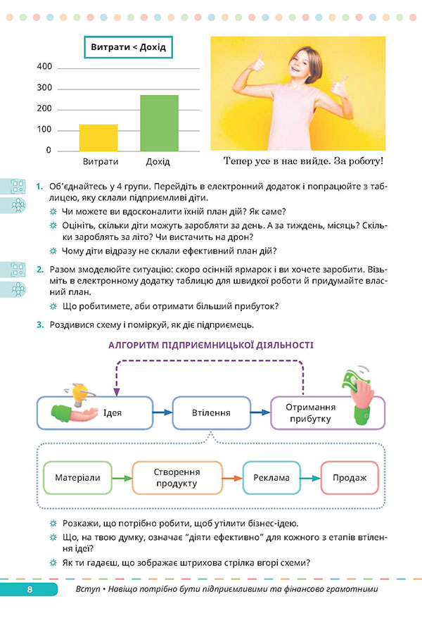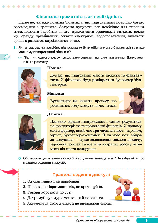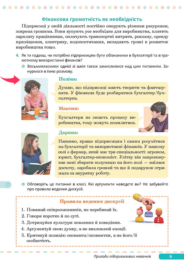 Докладніше про фінансову грамотність (дискусія, робота в групах) Підприємництво — це не лише ідеї, а й реальні дії, розрахунки, витрати, прибутки. Чи обов’язково підприємцям самостійно розумітися на фінансах, чи достатньо мати бухгалтера? — Прочитайте діалог підлітків на сторінці 9 підручника. ![]() ![]() Запитання для дискусії