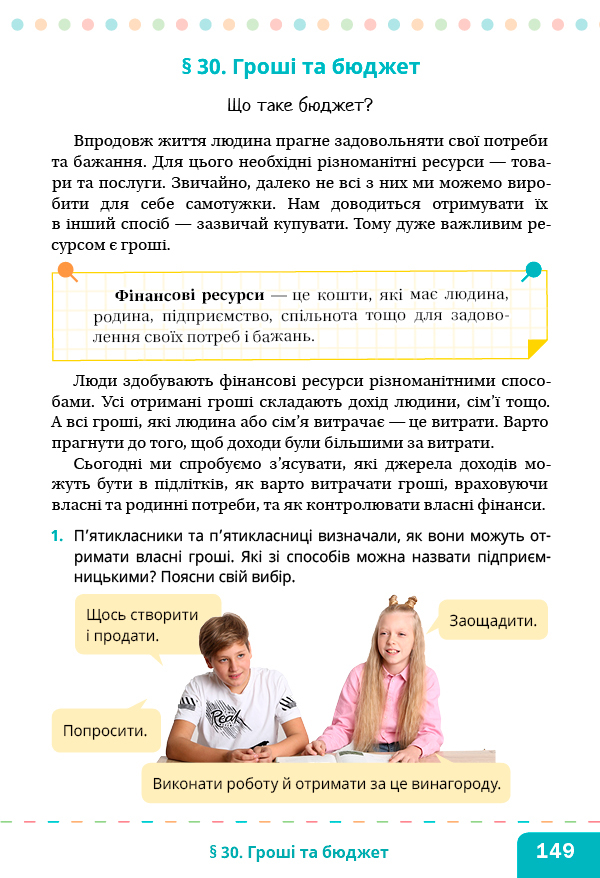 - учень / учениця знає, що таке фінансові ресурси, потреби і бажання, доходи, витрати, прибуток, бюджет, заощадження;
