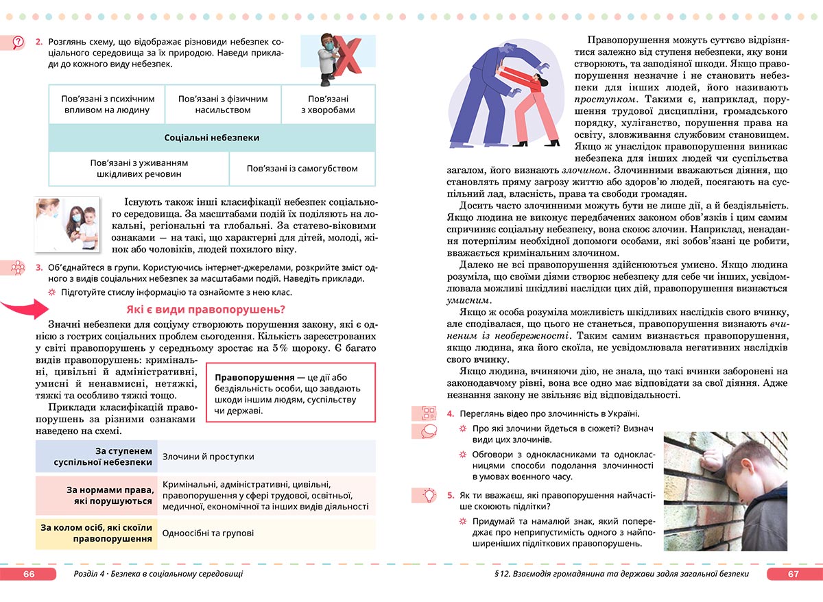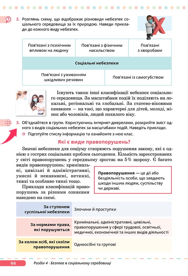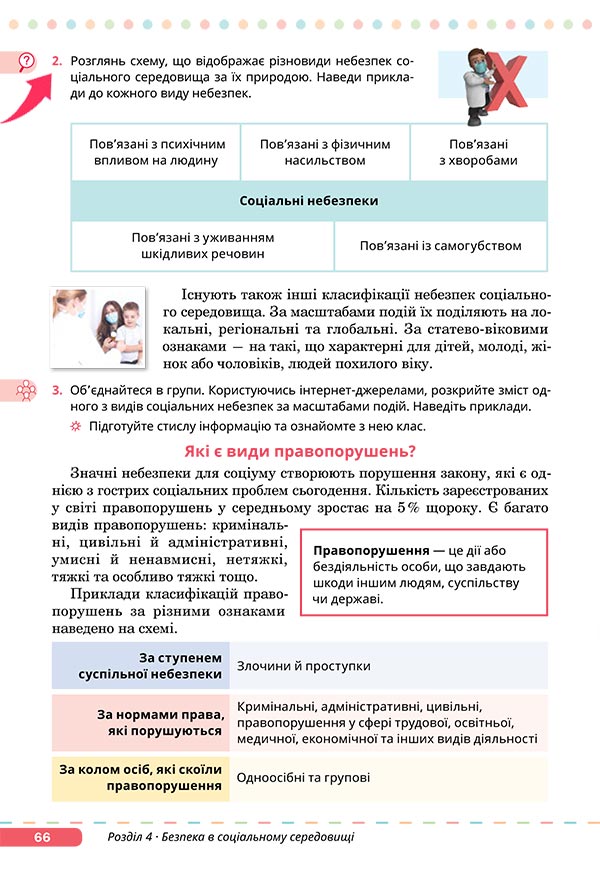 - наводить приклади небезпек соціального середовища, різновидів правопорушень за їх природою;