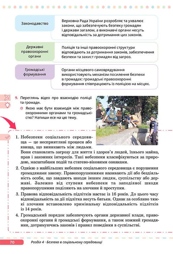 - Розгляньте графіку на сторінці 70. Як взаємодіють державні правоохоронні організації, громадські формування й законодавство?