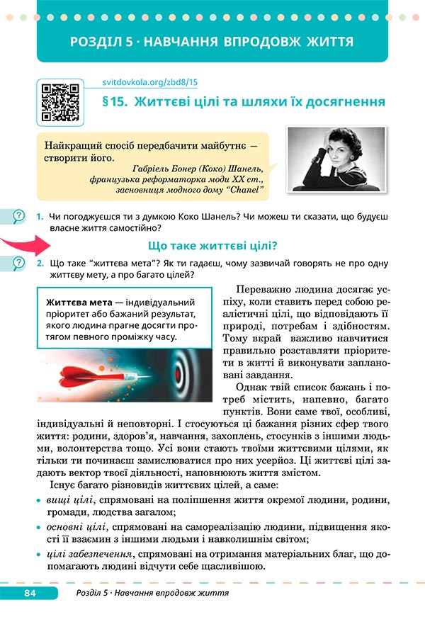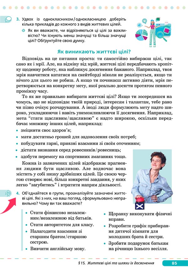 - Які різновиди життєвих цілей наведено в підручнику? Чим вони різняться і як пов’язані?