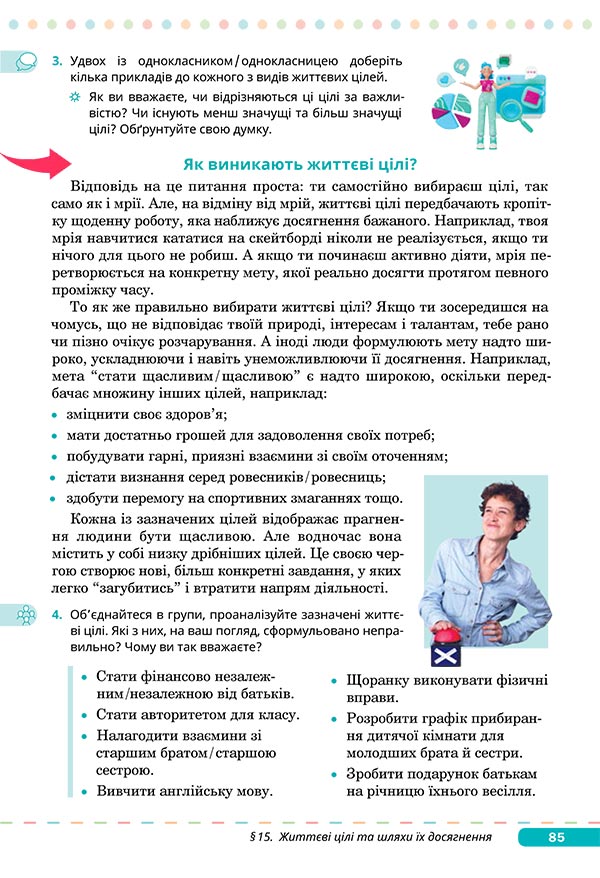 — Виконайте завдання 3 на сторінці 85 підручника. Удвох з однокласником / однокласницею доберіть кілька прикладів до кожного виду життєвих цілей.