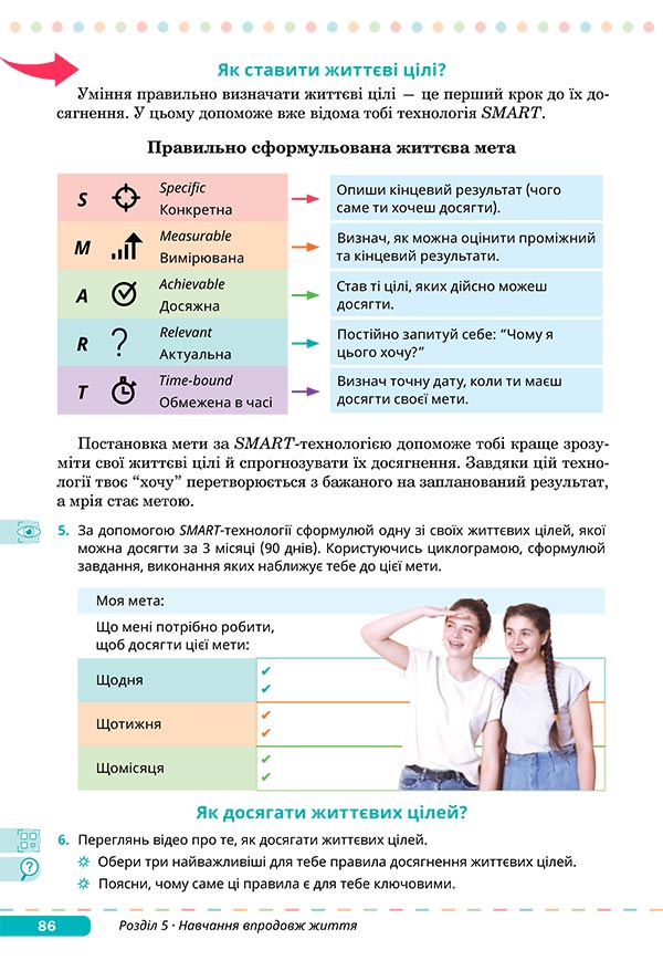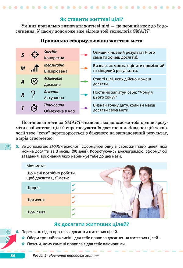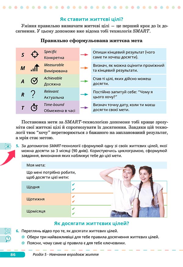 — Виконайте завдання 6 на сторінці 86 підручника, переглянувши відео про досягнення власних життєвих цілей.