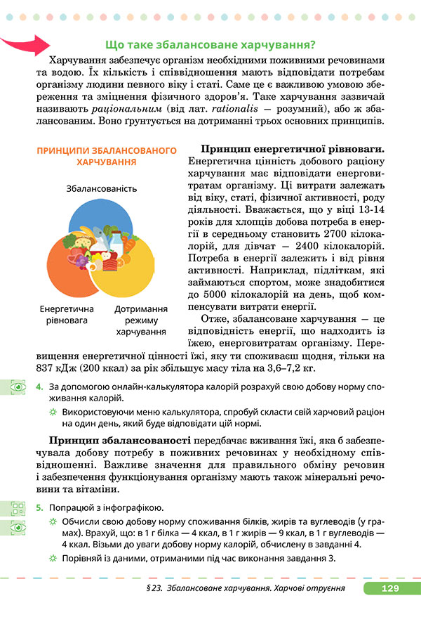 - описує принципи збалансованого харчування та групи основних поживних речовин;