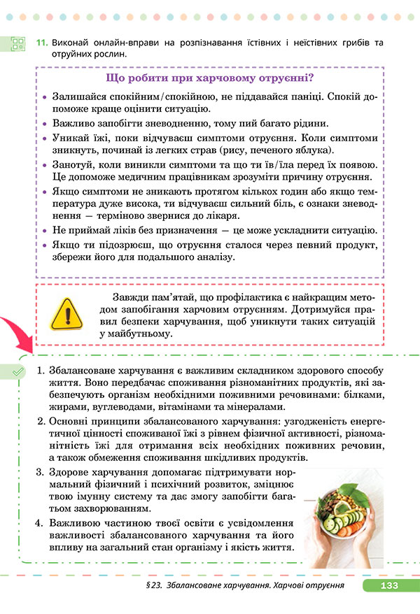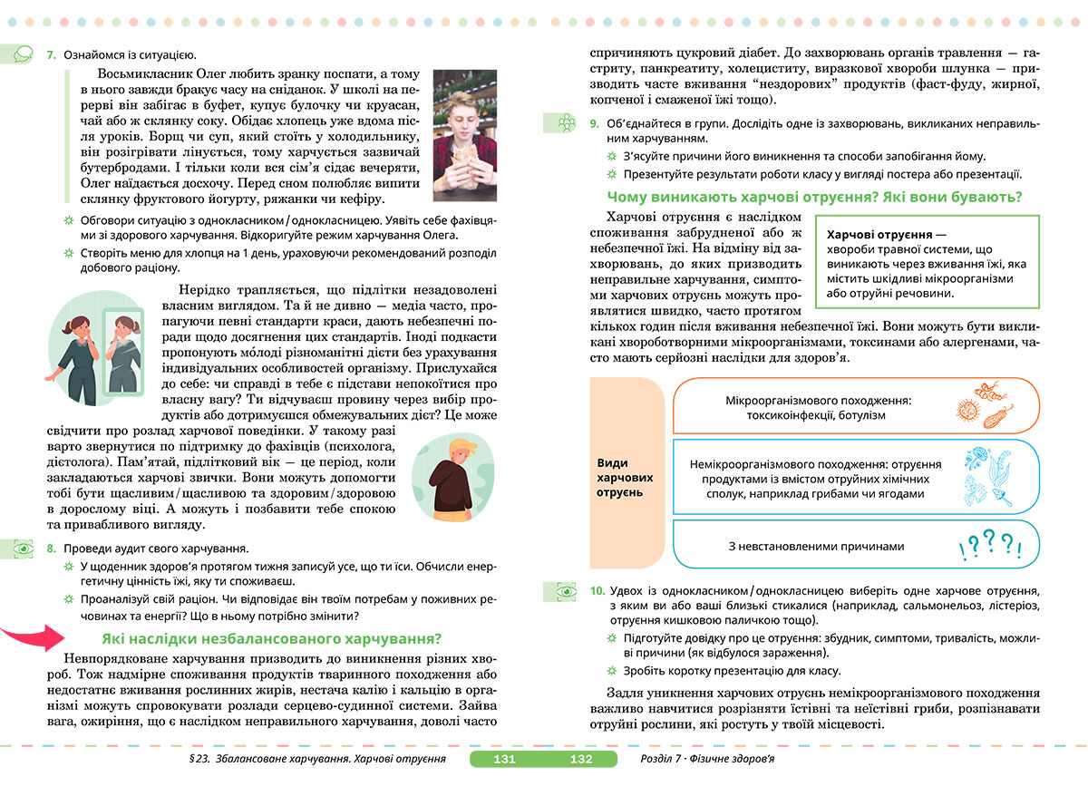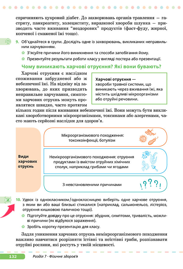 — Виконайте завдання 10 на сторінці 132 підручника. Об’єднайтеся у пари. Кожна вибирає одне харчове отруєння, з яким вони або їхні близькі мали справу. Приклади: сальмонельоз, лістеріоз, отруєння кишковою паличкою, отруєння грибами чи токсичними рослинами.